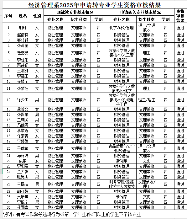 根据《关于做好我校2025年度转专业工作的通知》(院教函[2025]44号)文件要求,我系成立了转专业工作考核组,由工作组人员严格按照《必威西汉姆联学生转专业管理办法》(院政[2024]29号)文件规定,对必威西汉姆联2025年度申请转专业的学生进行了资格审核,现对拟审核通过的结果进行公示(见附件),公示期:2025年7月15日-7月17日。如有异议,请反馈给冯霞老师。
