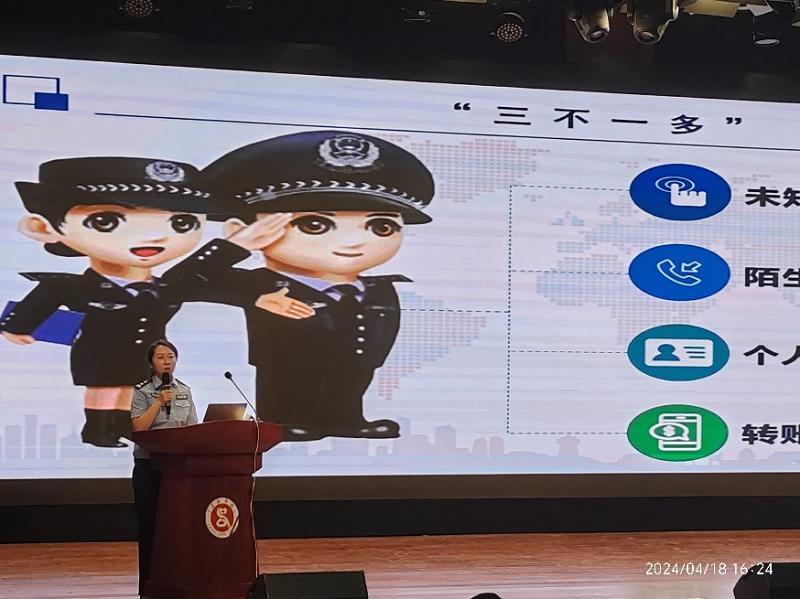 讲座中,罗警官结合身边发生的电信网络诈骗典型案例分别解读了什么是电信诈骗、大学生常见的电信网络诈骗手段、千万不要成为诈骗分子的帮凶、如何防范电信网络诈骗等内容,用通俗易懂的方式向同学们“输出”反诈知识,引导同学们学会辨识“不断升级”的诈骗手段,提高风险防范意识和法律意识,提示同学们切不可因贪小便宜向不法分子出租、出售、出借电话卡、银行卡,不要成为电信网络诈骗犯罪分子的帮凶,提醒同学们要做到“未知链接不点击、陌生来电不轻信、个人信息不透露、转账汇款多核实”。