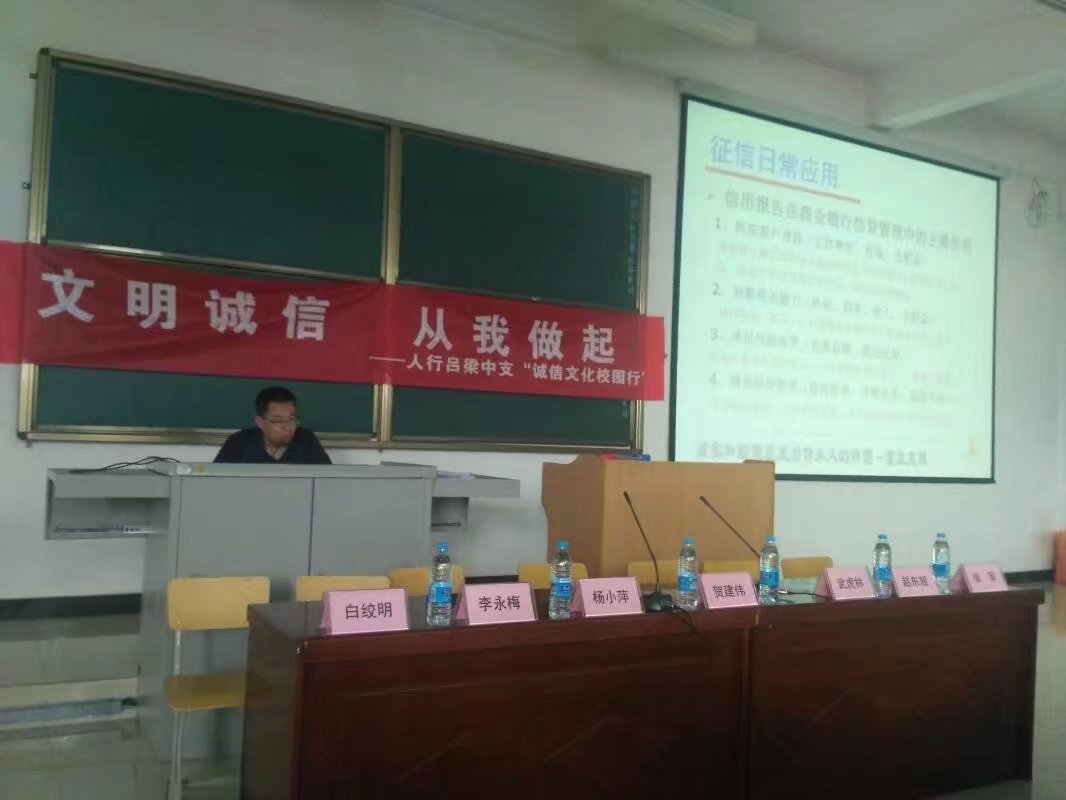 为加强大学生的诚信教育,提升对征信的认识,我校必威西汉姆联与中国人民银行吕梁市中心支行于6月15日上午在综B阶101教室举行了“诚信文化必威西汉姆联校园行”活动。人民银行吕梁市中心支行党委委员、工会主任贺建伟、征信管理科科长李永梅、团委书记张军、征信管理科副科长白绞明以及必威西汉姆联党政领导、教师和学生代表参加活动。