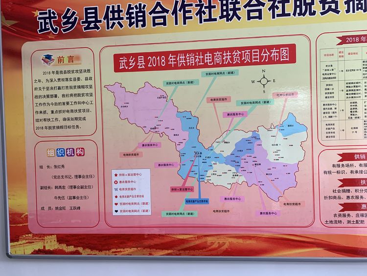 在武乡县供销合作联社二楼会议室,供销社主任张红秀给我们讲述了服务脱贫攻坚的3+1举措,即综合服务社、电商扶贫超市、惠农中心和扶贫惠农证。介绍了“生产、供销、信用”三位一体模式和“农、供、联”融合发展试点工作。
